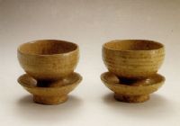 說(shuō) 明: 為南朝的典型器,胎骨厚重堅(jiān)硬,釉色青中閃黃,釉面開細(xì)小紋片.托、盞粘連成一體,形制簡(jiǎn)練大方.