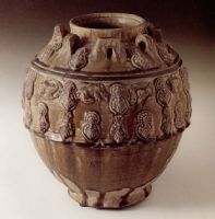 說 明: 此罐制作工整,應(yīng)用貼花工藝裝飾,代表了北朝青瓷的水平,是當(dāng)時(shí)珍貴的工藝品.