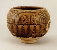說 明: 胎質(zhì)灰黃,坯上一層白色化狀土.施褐釉,光潤(rùn)透明.整體裝飾紋樣似一朵蓮花,雅麗華美.為隋代湘陰窯難得的精品.