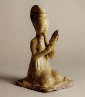 說(shuō) 明: 俑白胎,通體黃釉,并施彩繪,年久已脫落.此俑是黃釉樂舞俑群中的一員.