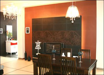 沙發(fā)背后的墻面采用了仿皮瓷磚,很有皮革的質感,上面還有花紋呢