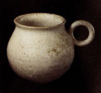 說 明: 環(huán)把小斗,也稱單耳罐,是仿唐代銀器的式樣.胎薄體輕,釉白中閃青,釉面布滿細小開片紋,是唐代貴族使用的精美酒具之一.