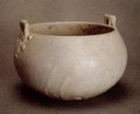 說 明: 瓷胎略灰,釉層凝厚,釉凝聚處呈青綠色.應屬晚唐河北定窯所燒造.