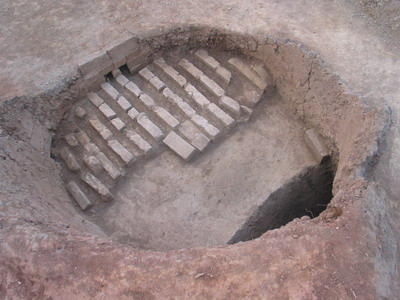 此次發(fā)掘窯址共3處,均為馬蹄形磚窯,其中1號(hào)磚窯保存基本完整。該窯東西朝向,磚窯總長(zhǎng)約10.3米,分窯室、火膛、火道、火門、操作間等。窯室略為圓桶狀,上口稍大,東西直徑約4.36米,高為2.8米。窯室內(nèi)壁設(shè)煙道3處、壁龕1處;鹛、火道長(zhǎng)約3.35米,平面呈喇叭形;痖T殘寬80厘米、高80厘米。操作間呈楔狀,殘長(zhǎng)3.9米、寬2米。經(jīng)發(fā)掘,窯內(nèi)出土部分城墻磚,每塊磚長(zhǎng)40.8厘米、寬20.2厘米、厚11.7厘米。同時(shí),還出土明代青花瓷片、青瓷盤、陶罐等遺物。