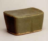 說 明: 施單色綠釉,無紋。枕長方圓角形,枕面微凹。