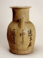 說(shuō) 明: 壺徑大且長(zhǎng),胎質(zhì)灰白,通體施青釉。流下腹部以下褐彩書(shū)寫諺語(yǔ)。