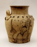 說 明: 器表外罩一層請黃色薄釉,即所謂釉下褐彩裝飾.罐為大口外卷唇,短徑微束.