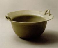 說 明: 內(nèi)壁滿釉,外壁無釉,露灰色胎。造型簡潔圓潤,釉色青純潤澤。