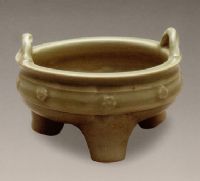 說 明: 直口平唇,束徑,鼓腹,平底下腹裝三足,足粗矮,內(nèi)空.胎灰白,施青灰色釉.