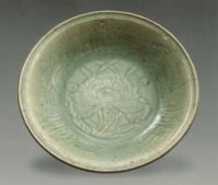 說 明: 內(nèi)底刻荷花、荷葉,刻花造型飽滿,非常生動。施天青色透明玻璃釉,有冰裂紋。