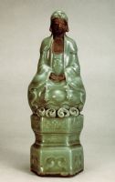 說 明: 容貌慈祥,神態(tài)生動(dòng),胎體厚重,釉色青綠,臉、胸及手裸露部分,呈赭褐色。