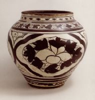說(shuō) 明: 底部露胎,胎體磚紅色,胎質(zhì)堅(jiān)細(xì)。器外施滿白色底釉,上繪黑褐色花卉圖案。