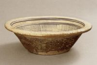 說(shuō) 明: 胎體厚重,胎質(zhì)較粗.大口外卷呈板沿,深腹斜直,平底呈玉壁狀.