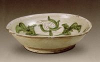 說 明: 紅色陶胎,上白色化妝土,施牙白色低溫鉛釉。紋飾粗狂豪放,清新爽潔。