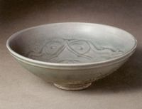 說 明: 碗內刻花裝飾清晰地顯露在明麗的青綠色釉下。