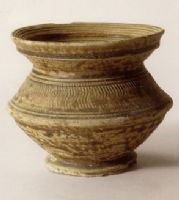 說 明: 原始青瓷。器表施青黃色釉。圖案帶條裝飾。