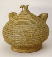 說 明: 原始瓷器。鷹頭形小口,斜長頸,溜肩。通體飾密集弦紋。