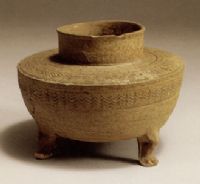 說 明: 原始青瓷。通體施青綠色薄釉。造型別致,器表裝飾華麗,釉面晶亮。