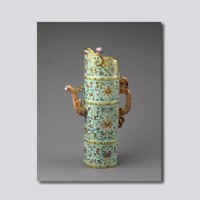 乾隆時期將"藏傳佛教"作為國教,在宮中經(jīng)常進行佛教法事,由于蒙藏地區(qū)的佛教僧侶與清宮往來頻繁,故在清御窯廠仿制了一些符合蒙藏生活習(xí)俗的器皿多穆壺,供佛教高僧使用或賞賜之用。瓷質(zhì)多穆壺有粉彩、青花、仿木釉等品種,另外還有琺瑯、象牙、漆器等材質(zhì)。