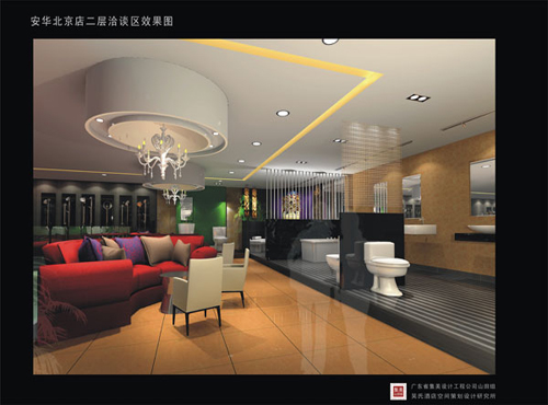 另外館內(nèi)還設(shè)有收銀水吧、休閑洽談區(qū)和VIP洽談區(qū),突出視覺沖擊力,強(qiáng)調(diào)小個體的空間感,同時結(jié)合空間的特點和共享性融合性,把握觀者的心里需求,強(qiáng)調(diào)氣氛和環(huán)境的統(tǒng)一和舒適。在風(fēng)格上,洽談區(qū)整體以輕松自然的休閑空間定位,天花以圓環(huán)造型,配上閃爍的燈珠效果,讓整個洽談區(qū)更放松更自由,連接洽談區(qū)和馬桶展示區(qū)的隔墻,利用了主題樹形隔斷,通透而不空蕩,更具視覺沖擊力。
