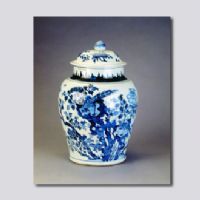 首都博物館藏。直口、短頸、豐肩、收腹,平砂底,高圓蓋,寶珠鈕,亦稱將軍罐。蓋面飾折枝桃、石榴、翠竹,頸部飾一圈變形蓮瓣紋,腹部繪雉雞牡丹圖。雉雞牡丹紋始見于明代嘉靖朝,康熙時(shí)期所繪牡丹花以夸張的手法將展開的花瓣分向兩邊,稱為雙犄牡丹?滴跚嗷ń梃b中國水墨畫中的“皴法”,同一藍(lán)色中分出深淺不同的多種色調(diào),素有“五彩青花”之稱。