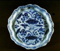胎質(zhì)潔白精細(xì)?谘卣圻,作八瓣葵花形,平底?谘乩L忍冬紋一周,盤心繪兩組并蒂蓮和水草紋。色澤濃艷,紋飾秀麗,為元代景德鎮(zhèn)窯青花瓷的精品。