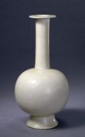 瓶平口外折,頸細(xì)長,圓腹,高圈足外撇。腹部刻螭龍穿花紋飾。此瓶造型優(yōu)美,胎體潔白,螭龍紋刻劃得矯健生動,刀工遒勁有力,線條自然清晰,為定窯的上乘佳作。