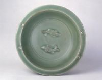 此洗敞口,折沿,圈足。洗心內(nèi)塑貼兩條游魚,外壁刻凸菊瓣紋一周?谘貎蓚(cè)各有兩個穿孔,相互對應(yīng),可用于穿飾金屬提環(huán),以便于提攜。此器釉色青翠,塑貼魚紋清晰,是南宋龍泉窯的典型作品。在韓國新安海底沉船中亦發(fā)現(xiàn)有類似器物。