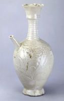 白釉瓷器在遼代較為盛行并具有民族特色,目前已發(fā)現(xiàn)龍泉?jiǎng)?wù)窯、赤峰缸瓦窯均有燒制。壺在遼瓷中有幾種造型:有與中原風(fēng)格近似的執(zhí)壺;有遼代特征明顯的雞冠壺等。此壺為遼代所特有,其造型端莊秀麗,口、頸、腹分別裝飾不同的花紋,口為花瓣形,頸飾以工整的弦紋間隔,腹部刻劃4朵盛開的鮮花。此壺刀法剛勁有力,線條流暢清晰,為遼代白釉刻花壺中的精品。
