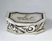 宋、金、元時(shí)期瓷枕品種多樣,形式紛繁,主要用作寢具,同時(shí)也用以隨葬。其中磁州窯瓷枕最具代表性,枕的造型各式各樣, 品種繁多,紋飾內(nèi)容多取材于民間生活,裝飾手法采用繪、刻、印、劃、剔、鏤等,特別是白地繪黑彩,運(yùn)用豪放的筆法,嫻熟的技巧,在不到半尺的枕面上揮灑自如,將繪畫藝術(shù)巧妙地運(yùn)用到瓷枕裝飾上,具有濃厚的水墨畫風(fēng)格。此枕色彩黑白分明,對比強(qiáng)烈,寥寥數(shù)筆,把馬戲表演中的精彩瞬間表現(xiàn)得淋漓盡致,富有濃郁的民間生活氣息。