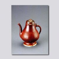 首都博物館藏。直口,垂腹,高圈足,足內(nèi)有2層臺,彎流,曲柄,柄上附小圓系,半圓形蓋。壺頸較元代稍短,比永樂時略長。胎質(zhì)細而潔白。其表有旋坯痕,釉層較薄,呈醬褐色。這是洪武時期的典型器物。
