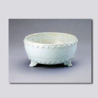 首都博物館藏。敞口,淺腹,平底,底部承以獸面三足。內(nèi)外施青白釉。內(nèi)心及外底均無(wú)釉,口沿及近底處各環(huán)飾一周整齊的乳釘紋,外壁刻串枝蓮花。器表釉色光潤(rùn),造型別致。