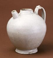 壺斂口,短頸,圓腹,圈足。肩一側(cè)有短流,對應(yīng)一側(cè)有壺柄,柄上端飾裝飾結(jié)。此壺造型小巧,釉質(zhì)白潤,是河北邢窯唐代的產(chǎn)品。