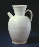 壺敞口,長圓腹,平底,小短流,頸與腹部有曲柄相連。通體施白釉,外部施釉不到底。