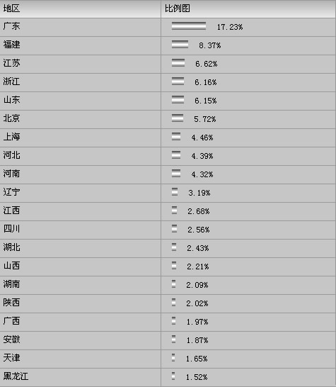 根據(jù)#統(tǒng)計分析,從2008-1-1起至2008-7-23日中華陶瓷網(wǎng)地區(qū)訪量排名如下: