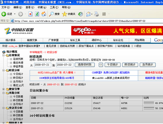 據(jù)中國站長統(tǒng)計(#)對中華陶瓷網(wǎng)訪問統(tǒng)計顯示,中華陶瓷網(wǎng)7月21、7月22日,日pv訪問量分別突破215124、212292,均突破20萬大關(guān)。以下是#統(tǒng)計截圖: