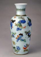 瓶撇口,短頸,豐肩,肩以下漸收斂,圈足。通體白釉五彩裝飾。頸中部繪如意頭紋、錦地朵花、圓點(diǎn)紋各一周,頸、肩相接處繪錦地如意紋一周,肩下至足部繪飛舞的彩蝶,間以蜻蜓,外底青花雙圈內(nèi)繪靈芝。畫工以細(xì)膩的筆觸描繪了彩蝶三五成群、或聚或散的景致,極盡寫生之妙。
