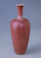 豇豆紅釉器外壁的銅紅釉是分幾次吹釉然后高溫燒成的。由于釉中含有微量銅的成份,在燒成過程中會造成氧化而產(chǎn)生綠色的斑點,俗稱苔點,摻雜在紅釉色中相映成趣。康熙朝創(chuàng)新的萊菔瓶中以豇豆紅釉為最佳,此瓶釉色勻凈典雅,只在口部呈現(xiàn)綠斑點點,惹人喜愛。