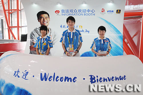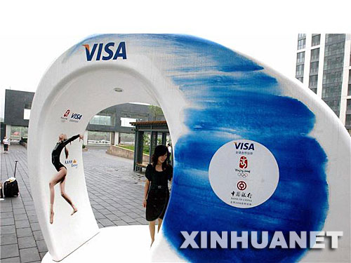 7月24日,在首都國(guó)際機(jī)場(chǎng)新落成的T3航站樓,靚麗的Visa"太極青花瓷"奧運(yùn)觀眾歡迎中心已經(jīng)正式亮相啟用。新華網(wǎng) 尤亮 攝
