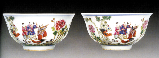 據(jù)有關(guān)專家介紹,在本次拍賣會(huì)上成交的這對(duì)乾隆琺瑯彩嬰戲雞圖紋碗,“為乾隆官窯琺瑯彩難得之上上佳品。”這對(duì)高7.5厘米,口徑為15.5厘米的白瓷胎碗不但選料清純,胎質(zhì)堅(jiān)硬潔白,而且畫工精湛,碗內(nèi)用珊瑚紅點(diǎn)染五福捧壽,碗外所繪花卉、嬰童、雄雞無(wú)不栩栩如生,而碗壁上的題詩(shī)“春風(fēng)和靄柳絮飛,稚童嬉雞情趣濃”,為典型的乾隆館閣體,使整個(gè)畫面于寶光十足中更添詩(shī)意與雅趣。