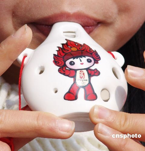 在江西省景德鎮(zhèn)營(yíng)業(yè)員吹奏“唱響福娃塤”。