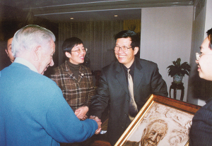 | 國際奧委會名譽(yù)主席薩馬蘭奇(左一)在北京接見了工藝美術(shù)大師金全才,并接受了贈送的瓷刻肖像。 (資料圖片) |