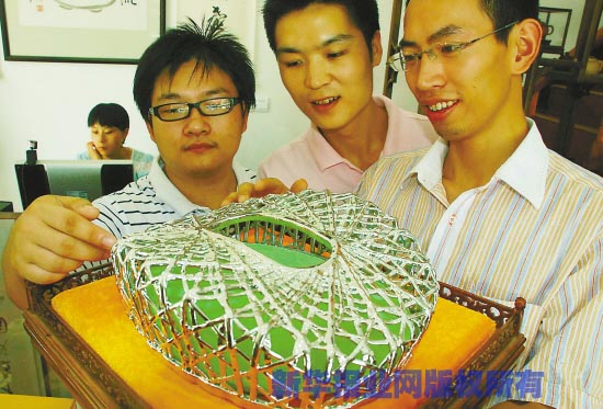 在宜興中國陶都陶瓷城,幾名青年在觀看用陶瓷做成的富有奧運元素的“鳥巢”。奧運會前夕,宜興民間藝人劉家發(fā)、王彩燕以該市承擔鋼結構建設任務的國家主體育場“鳥巢”為原型,趕制成陶瓷“鳥巢”,吸引了眾多鄉(xiāng)鄰前來觀賞。圖為陶瓷“鳥巢”。