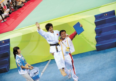 當(dāng)計(jì)時的秒表指向“零”時,在場下緊張觀戰(zhàn)的冼東妹教練興奮地?fù)]舞著雙拳大聲叫喊,而當(dāng)冼東妹走下場時,教練高興地將她扛起走了幾步。剛剛放下,教練發(fā)現(xiàn)不少攝影記者都在為這位冠軍拍照時,又再度將弟子扛起,而“媽媽冠軍”則在教練寬厚的臂膀上輕輕向眾人揮手致意,臉上露出幸福的微笑。