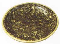 平沿,方唇,淺腹,平底中心微凸。胎體較厚。絞胎是由不同色調(diào)的胎料絞合形成圓案紋飾,是唐宋時代特殊的陶瓷裝飾藝術(shù)。此盤由黃色釉和赭色泥料相間糅合形成木紋狀,施釉薄且亮,紋理清晰自然,色彩效果甚佳。此盤為唐代絞太紋瓷器中的佳作。