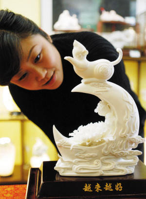 一名顧客在觀賞用白瓷燒制的鼠年吉祥物“越來越好”。當(dāng)日,“德化窯精品瓷器展”島城亮相,近百件來自福建德化窯的“中國白”與“鼎晟紅”瓷器在閩江路錢匯工藝品廳開始展出。記者看到,這尊《越來越好》的白瓷工藝品,設(shè)計(jì)者把一只可愛的小老鼠(俗稱:耗子)放置在一輪彎彎的月亮上,預(yù)示著我們的生活“越來越好”。據(jù)該店經(jīng)理牟女士介紹,福建省德化縣是中國的三大古瓷都之一,古代以燒制“中國白”而聞名中外,新近出水的南海一號宋代沉船上,就發(fā)掘出不少出自該縣的“中國白”工藝品。“中國白”不僅具有收藏價(jià)值,而且是收藏品中的珍品。它既能給居家增添文化氛圍和美的享受,又能給人們帶來增值效應(yīng),因此,歷來備受人們的青睞。