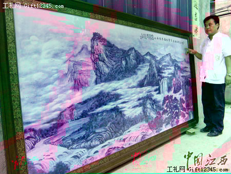 近日,由中國(guó)高級(jí)工藝美術(shù)師、景德鎮(zhèn)高專美術(shù)教師占曉初創(chuàng)作的,紀(jì)念抗震救災(zāi)特大幅青花瓷板畫(huà)《巴山蜀水映日月,青松豪情照丹心》,在景德鎮(zhèn)昌江區(qū)問(wèn)世。該作品采用傳統(tǒng)的青花工藝技法,描繪了四川秀麗的山水,氣勢(shì)恢弘,用青松的堅(jiān)韌象征中華民族抗震救災(zāi)的不屈精神,長(zhǎng)2.4米,高1.2米,用了500克天然青花瓷料,是目前全國(guó)最大的工筆青花山水瓷板畫(huà)。