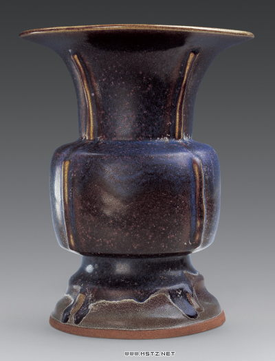 此紫紅釉出戟尊為日本伊豆高原美術(shù)館的珍藏品,高28厘米,口徑23厘米,底徑18厘米。尊的造型仿古代青銅器樣式,喇叭形口,扁鼓形腹,圈足外撇。頸﹑腹﹑足四面均貼條形方棱,俗稱“出戟”。日本全國博物館界最權(quán)威的機構(gòu)“日本博物館協(xié)會”在其主辦的《博物館研究》第32卷第11號(平成9年11月25日發(fā)行,既1997年)以此尊作為封面,并在目錄頁有這樣的說明:“封面:【紫紅釉尊 鈞窯】宋末元初時代 13世紀(jì) 高28cm 口徑23cm 底徑18cm 伊豆高原美術(shù)館”。在第40頁有專文介紹伊豆高原美術(shù)館,列舉了該館的經(jīng)典藏品,代表作品有“狩野探幽”﹑“花鳥人物屏風(fēng)”﹑“紅釉羊頭把手大瓶”﹑“鈞窯紫紅釉尊”等。1997年6月,在日本東京舉辦的“中國鈞窯珍品展”引起強烈轟動,日本伊豆高原美術(shù)館長對中如云先生這樣說:“中華民族的歷史悠久﹑文化燦爛,陶瓷藝術(shù)世界聞名,鈞瓷不僅屬于中國人民,也應(yīng)該為世界人民所擁有。” 傳世宋代鈞窯瓷器以各式花盆和花盆托最為多見,出戟尊較為少見,最為珍貴。上海博物館收藏一件宋代鈞窯月白釉出戟尊,臺北故宮博物院收藏有宋代鈞窯丁香紫釉出戟尊。
