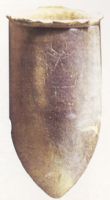 夾砂灰陶。侈沿,直口,筒形深腹,尖圜底。腹上部刻有“凸”,為圖像文字。此器為泥條盤築法手制而成,胎質(zhì)堅硬,反映出大汶口文化較高的陶器製作和燒造水平。