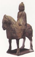泥質(zhì)灰陶。俑頭戴兜鍪,面形消瘦,眉梢上陽(yáng),目視前方,雙唇緊閉,神情嚴(yán)肅、剛毅;全身著鎧甲,左披套衣,露右肩,左手作持物狀,右手握拳作持物狀,騎於戰(zhàn)馬之上。
